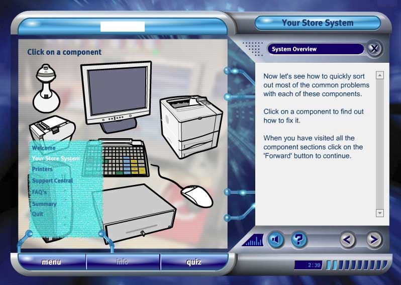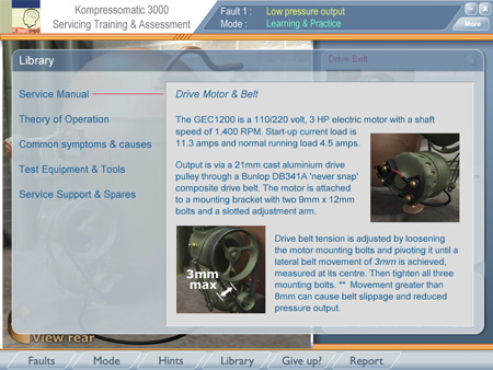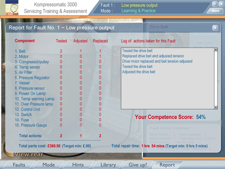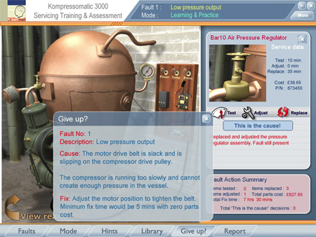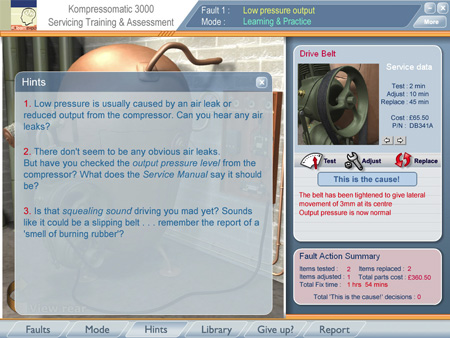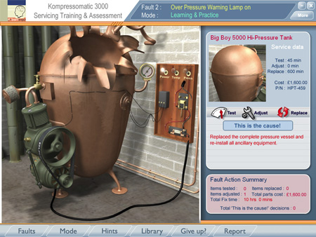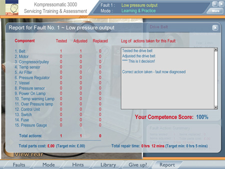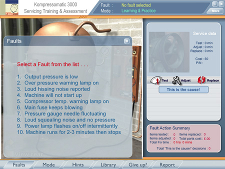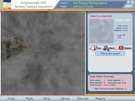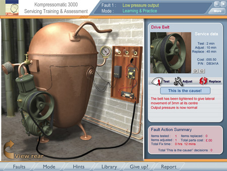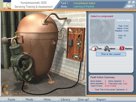 Each component may be selected and then tested, adjusted and replaced. Every action carries with it a cost, both in actual job time and in parts. When the learner takes an action, they receive feedback according to the nature of the fault.