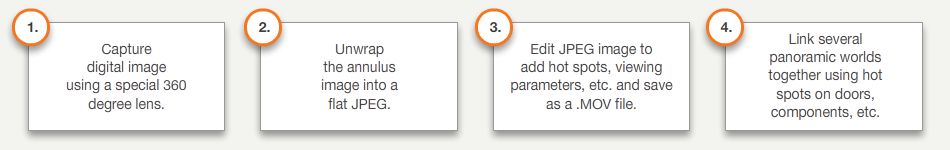 Several different QTVR movies were demonstrated in learning exercises but the process for creating them was similar. To create a panorama we would use these steps: